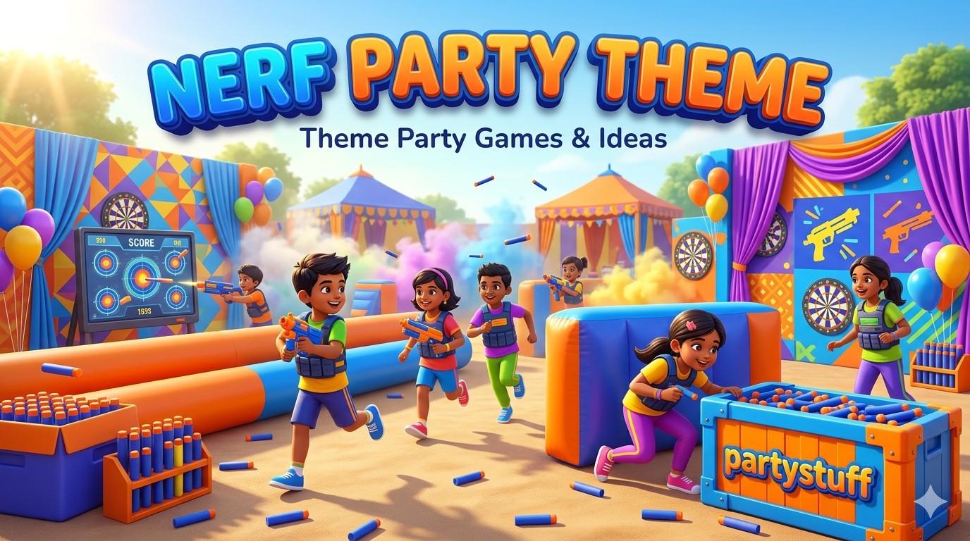 Other similar themes for Nerf theme can be Aladdin, Alice, Baby Shark, Beauty Beast, Ben 10, Ben Holly, Boss Baby, Cartoon, Charlie Chocolate, Chhota Bheem, Cinderella, Cocomelon, Dora, Doraemon, Elena, Elsa, Fairytale, Flash, Frozen, Harry Potter, K-Pop, Little Pony, Madagascar, Mario, Mermaid, Mickey Mouse, Minion, Motu Patlu, Nerf, Oggy, Paw Patrol, Peppa Pig, Pikachu, PJ Mask, Pokemon, Pooh, Popeye, Power Rangers, Powerpuff Girls, Sanrio, Spiderman, Superhero, Tom and Jerry .