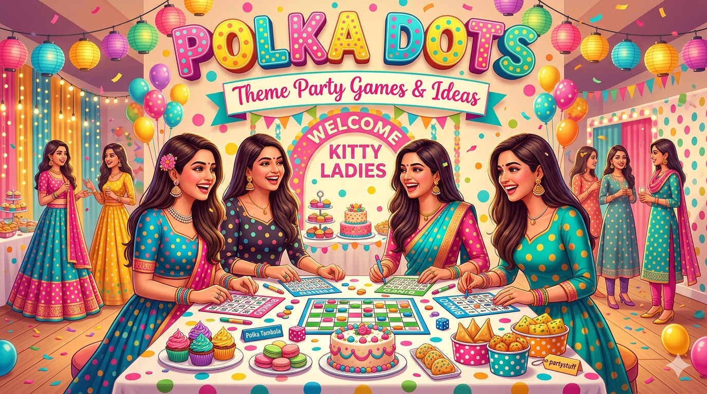 partystuff offers Tambola Housie, Paper Games, Labels, Cards for Polka Dots theme event.